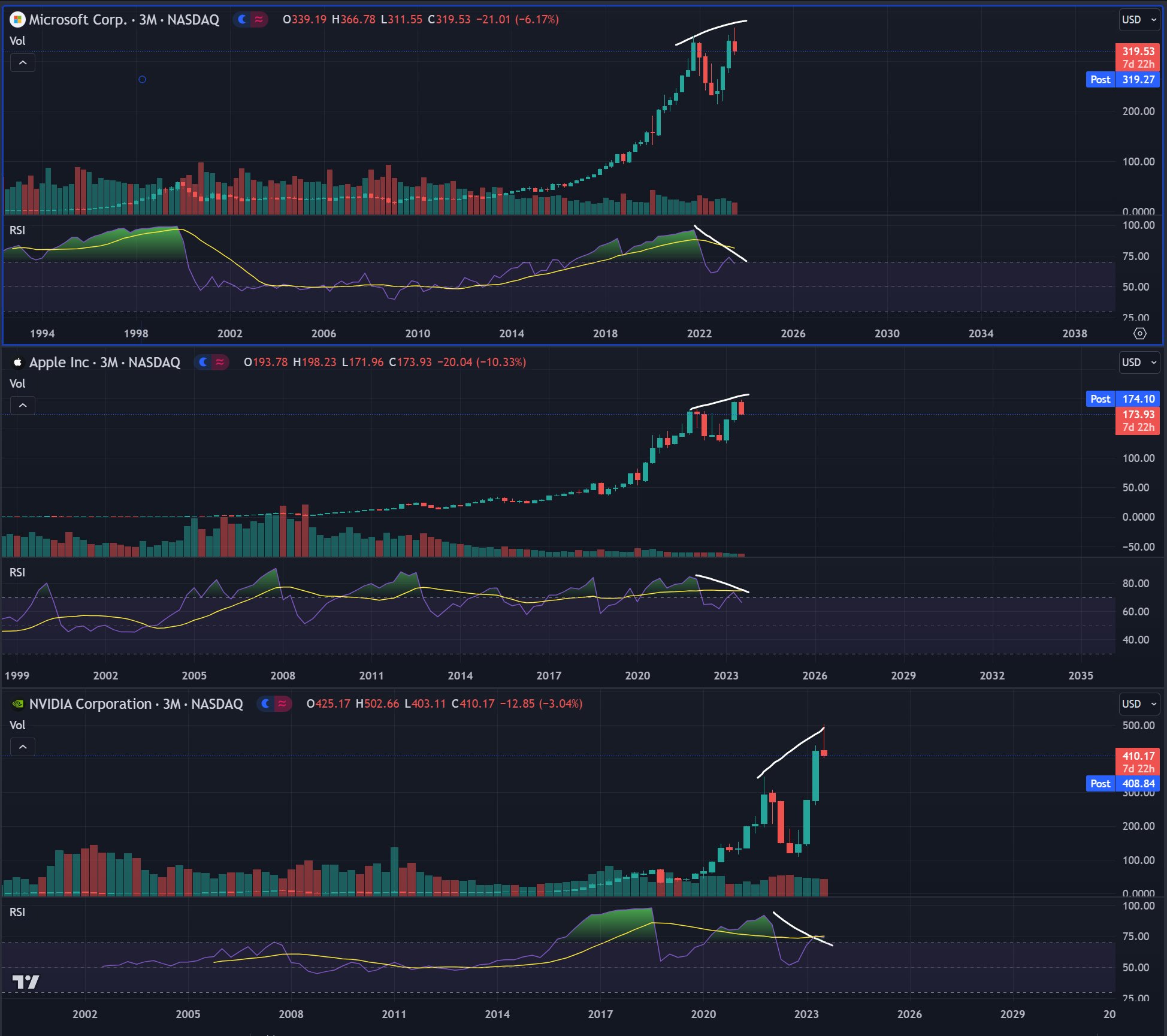 „Kvartálne grafy sa uzavrú o týždeň a na megakapitáloch sa práve teraz tvoria úplne príšerné štvrťročné sviečky a [klesajúce divergencie],” pokračoval Bluntz na X (Twitteri).