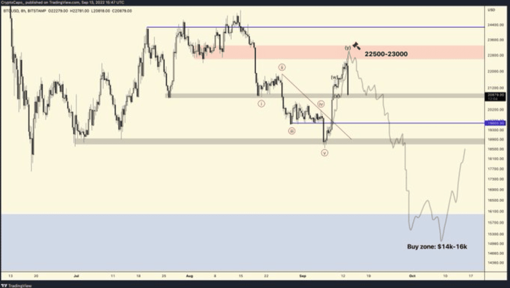 Obchodník Capo zdieľal status na svojom twitteri, kde má vyše pol milióna sledovateľov. Ako hlavný cieľ Bitcoinu označil cenové pásmo od 14 000 do 16 000 dolárov. Na grafe nižšie môžeme vidieť pohyby, ktoré podľa analytika nastanú v blízkej budúcnosti na trhu s Bitcoinom.