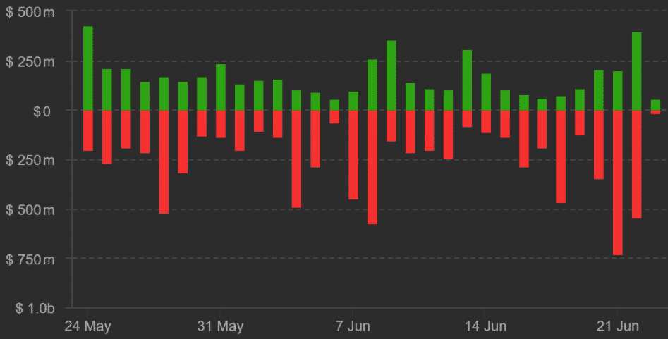 22. júna bolo zlikvidovaných približne 600 miliónov USD v longových pozíciách, čo predstavuje pokles o 150 miliónov v porovnaní s predchádzajúcim dňom.