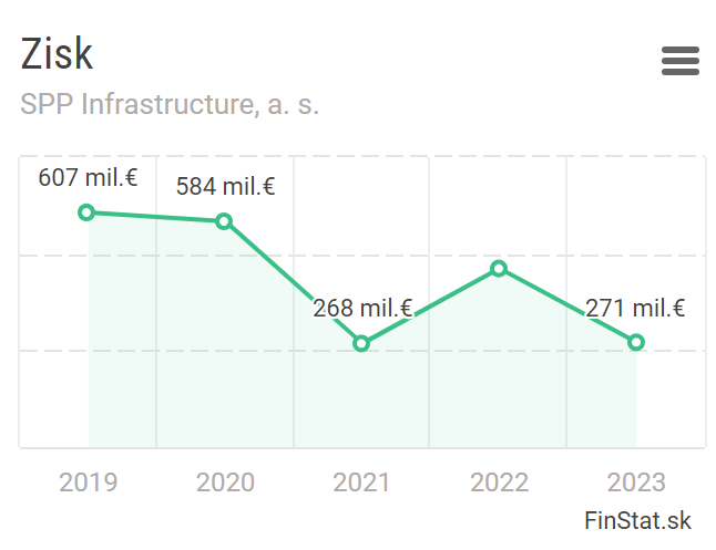 Spoločnosť SPP Infrastructure, a. s. v roku 2023 znížila zisk o 41 % na 271,0 milióna eur. V roku 2022 totiž zisky dosahovali úroveň 462 milióna eur. Firma vznikla 3. júla 2013. Celkové aktíva dosahuje na úrovni 5,2 miliardy eur, zatiaľ čo vlastný kapitál je na úrovni až 5 miliárd eur. Celková zadlženosť spoločnosti je len na hodnote -4,94 %.