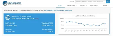 Napriek tomu, že existuje viacero slušných ethereových explorerov, Etherscan.io sa dá považovať za najobľúbenejší. Poskytuje možnosť vyhľadávania adries smart kontraktov, sledovanie gas price či overovanie zostatkov tokenov na adresách majiteľov. Rovnako ponúka ucelený prehľad všetkých ERC20 tokenov, pričom v prehľadnej tabuľke k nim okrem základných informácií priraďuje aj ich cenu, percentuálnu zmenu ich hodnoty alebo zobchodovaný objem za posledných 24 hodín. Pridanou hodnotou je určite aj „mining” kalkulačka a DEX tracker.