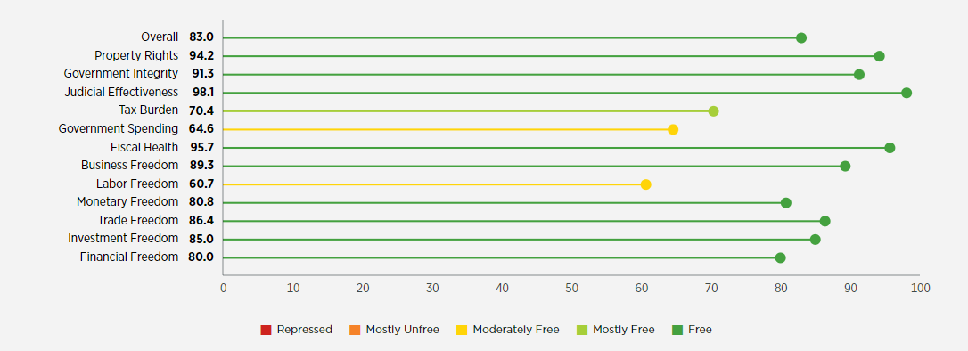 Švajčiarsko je najotvorenejšou ekonomikou v Európe. Výborne zabezpečené vlastnícke práva vrátane práv duševného vlastníctva podporujú podnikanie a produktivitu v krajine. Korupcia je takmer nulová vďaka efektívnemu právnemu systému. Súdny systém je totiž nezávislý od politických vplyvov.