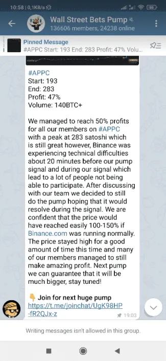 Tento fenomén sa naplno rozbehol v roku 2018, kedy bola bohatá sezóna altcoinov a ľudia boli strašne chamtiví. Princíp takejto skupiny je jednoduchý. Vo vopred určený čas zverejníme nejakú kryptomenu, ktorú spolu pumpneme a zarobíme spolu poriadne zisky! Super, nie? Na obrázkoch nižšie si môžete takúto skupinu pozrieť.